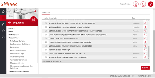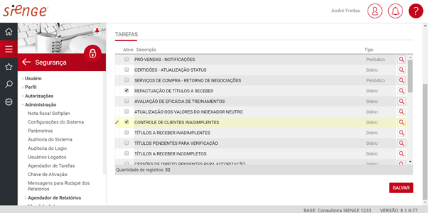 - Para usar a funcionalidade de Controle de Notificação de Inadimplência, é preciso habilitar o agendador de tarefas relacionado à notificação de cobranças e ao controle de clientes inadimplentes. Para isso, acesse: Segurança > Administração > Agendados de Tarefas e marque as flags “notificação de cobrança” e “controle de clientes inadimplentes”.