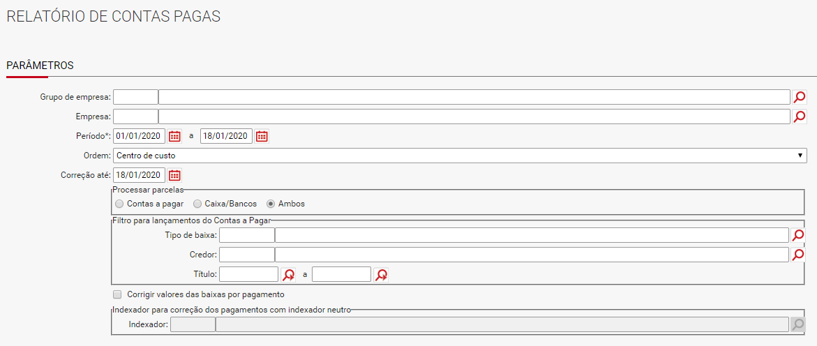 Os parceiros estão vinculados ao centro de custo, com a sua porcentagem de participação. Para que essas informações sejam apresentadas nos relatórios de Contas a Pagar e Contas Pagas, o campo ordem do relatório deverá estar por centro de custo.