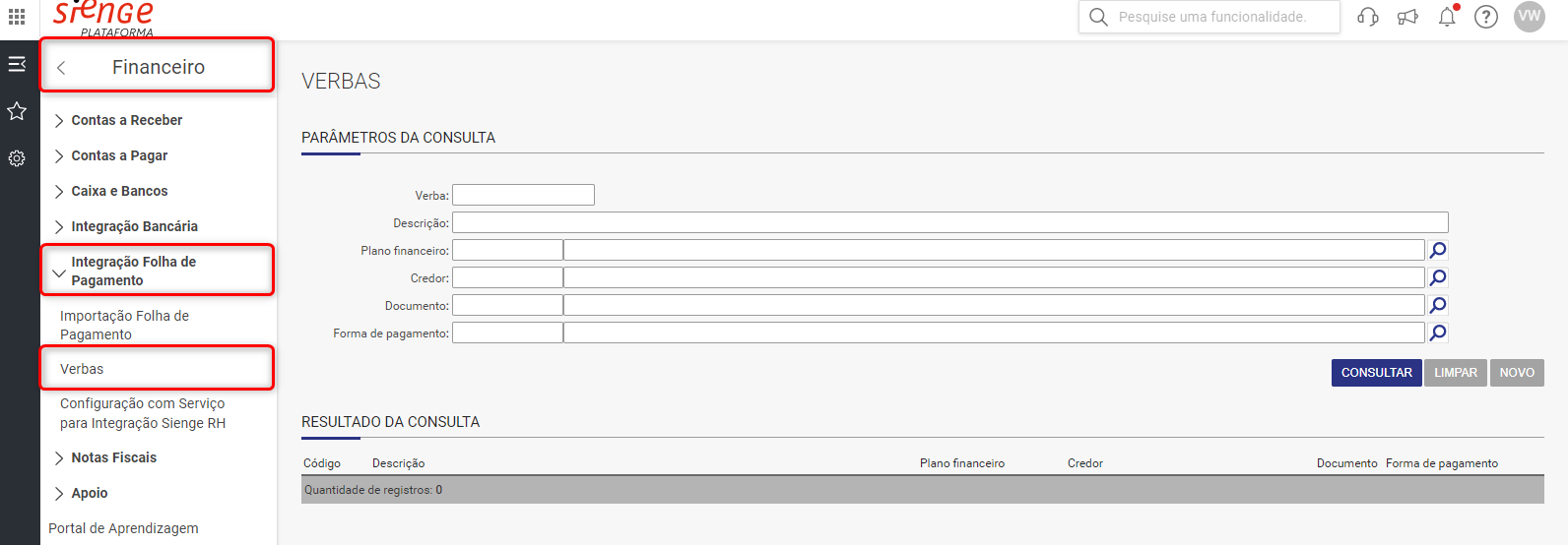 - Acesse: Financeiro > Integração Folha de Pagamento > Verbas;
