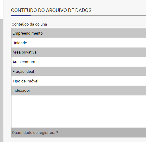 Área privativa, Área comum, Área comum DNP, Área do terreno, Fração ideal, Fração ideal em m², Quantidade indexada e Fração do VGV: devem estar em formato numérico. Os zeros à esquerda serão removidos, assim como os algarismos depois da vírgula que ultrapassem a capacidade do campo;