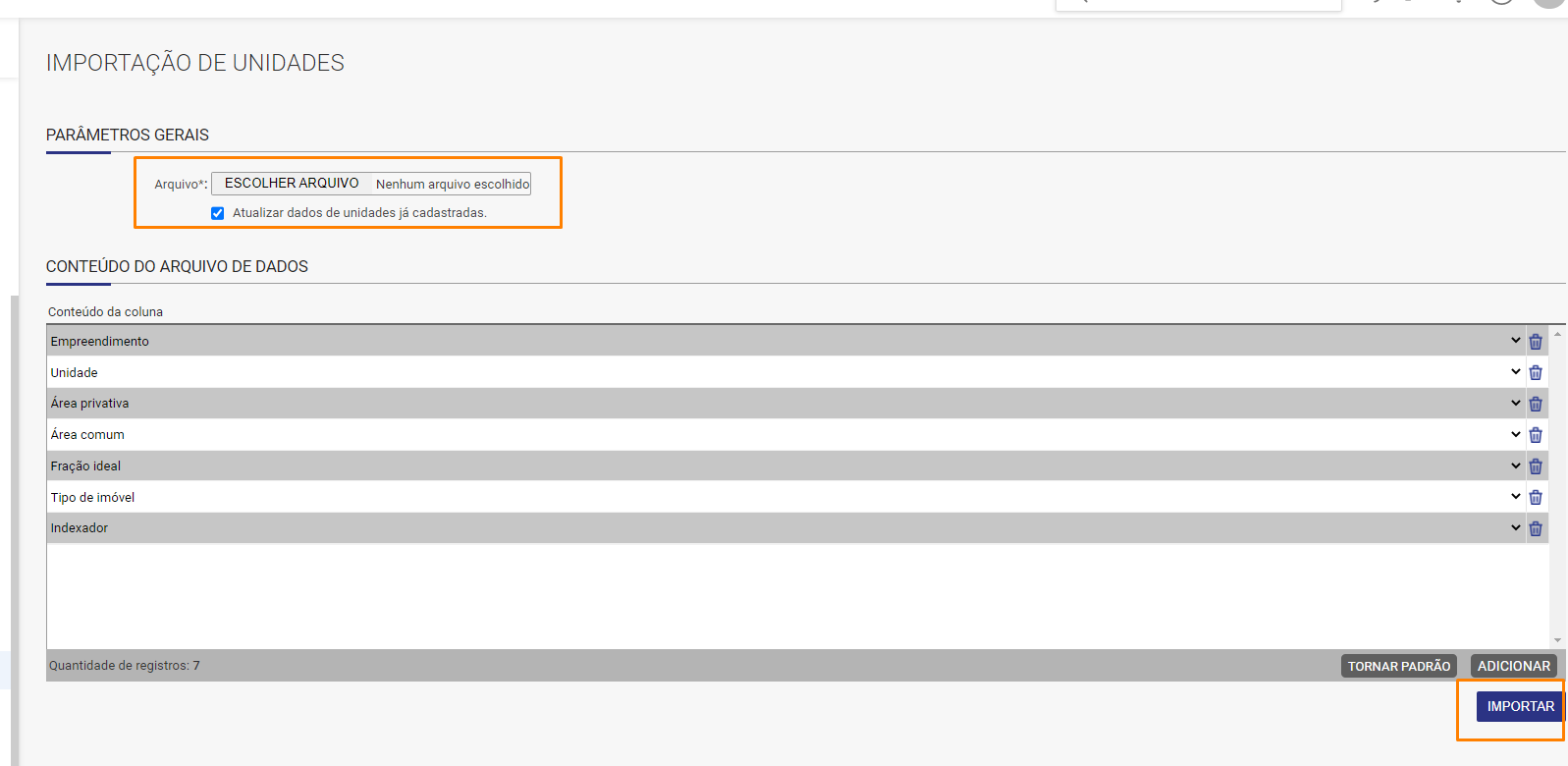 Em Comercial / Gestão de Unidades / Unidades / Importações / Importação de Unidades, no campo Conteúdo do Arquivo de Dados, deve ser informada a ordem em que estão organizadas as colunas no arquivo Excel, ou seja, a coluna A do arquivo corresponde ao primeiro conteúdo informado, a coluna B corresponde ao segundo conteúdo e assim por diante.