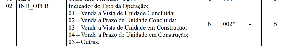 Com essa combinação de informações, da forma de pagamento "A vista" ou "A prazo" e do estoque da obra "Projeto", "Em Construção" e "Concluído", o campo 02 do registro F200 é gerado obedecendo os códigos: