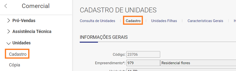 → Comercial / Apoio / Unidades / Cadastro
