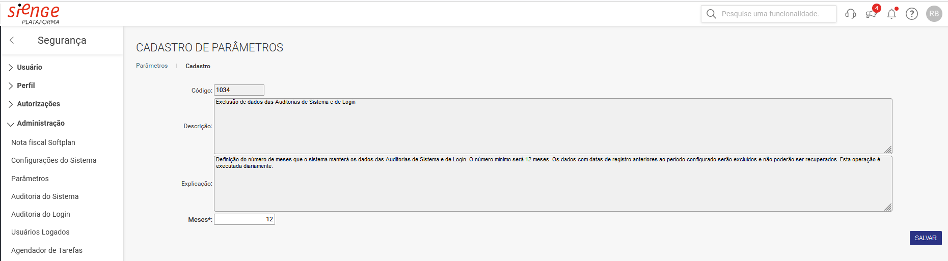O padrão do sistema é que os dados fiquem armazenados por 12 meses, ou seja, ações realizadas até um ano atrás podem ser auditadas. Mas isso pode ser alterado em Segurança > Administração > Parâmetros consultando e editando o parâmetro 1034.