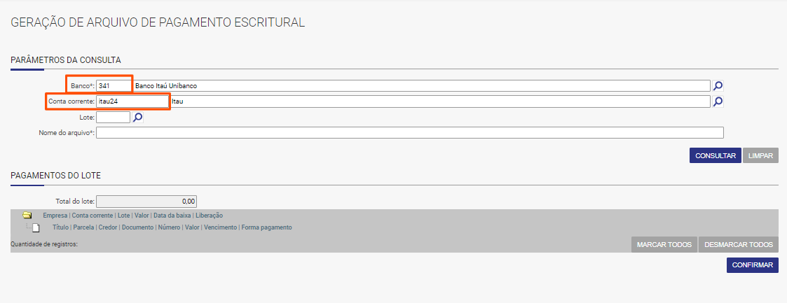 - Acessar Financeiro / Contas a Pagar / Pagamento Escritural / Gerações de Arquivo;