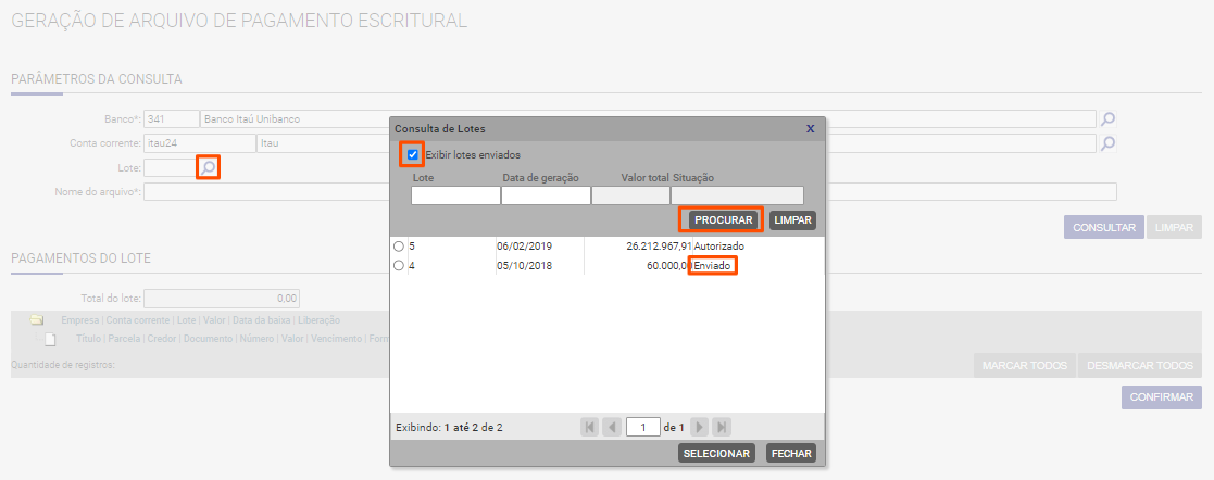 - Para poder visualizar os que já foram gerados anteriormente, marcar a flag "Exibir lotes enviados" e clicar em "Procurar";