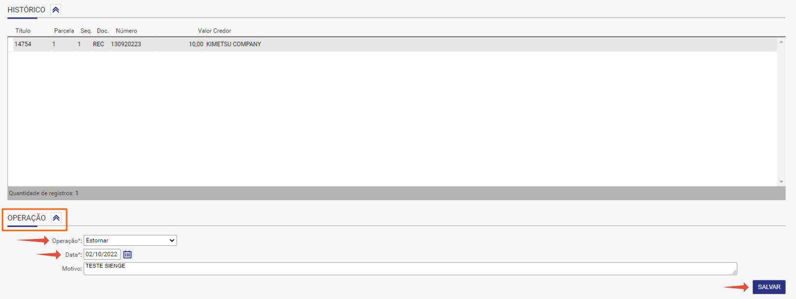 Na aba operações com cheque deve selecionar a opção Estornar, informe a Data que creditou o valor na sua conta e clique em SALVAR.