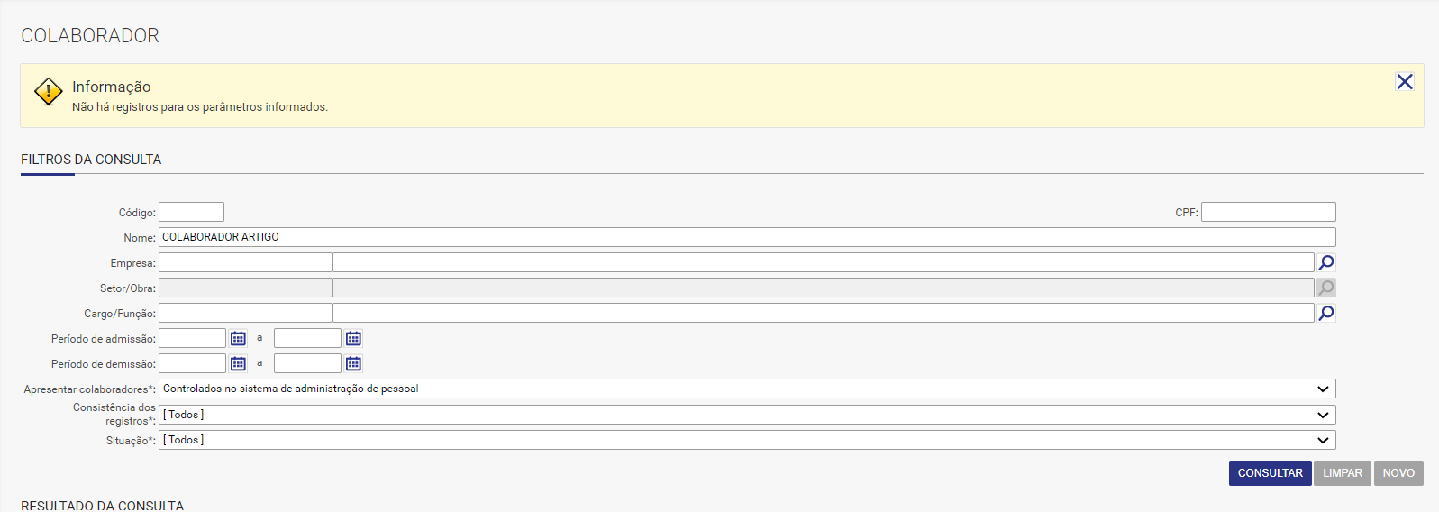 1- Ao pesquisar pelo colaborador "COLABORADOR ARTIGO" em Administrativo / Administração de Pessoal / Colaboradores, perceba que aparece a mensagem que não há registros para os parâmetros informados: