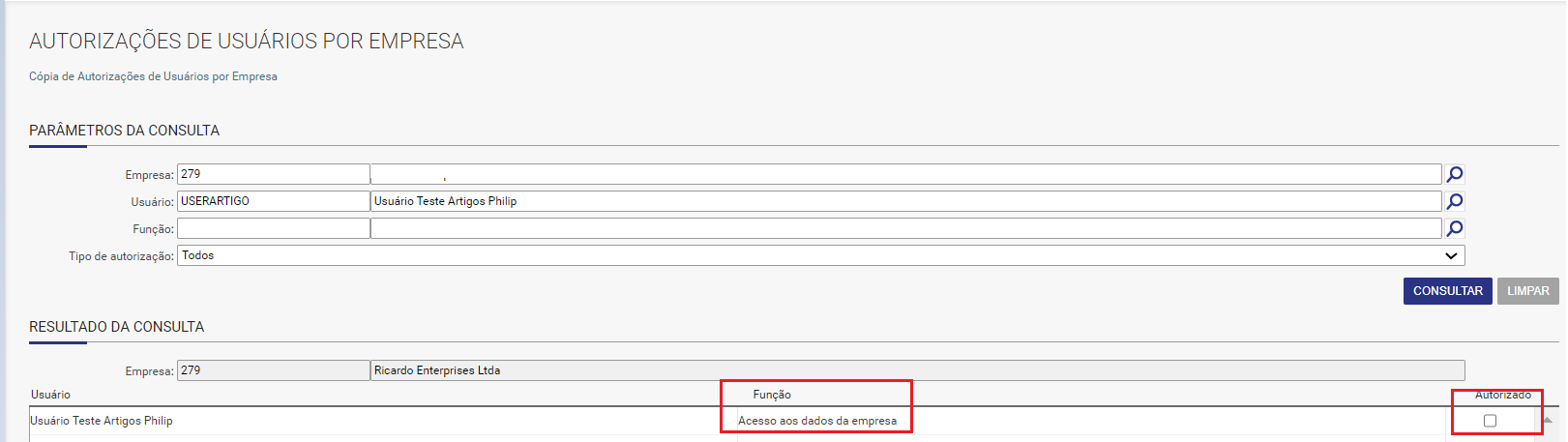 3 - O usuário administrador precisará acessar Segurança/Autorizações/Usuários/Empresas, pesquisa pela empresa que o colaborador foi associado e pelo usuário que deseja a liberação, e marcar a flag "Acesso aos dados da empresa" e salvar a alteração.
