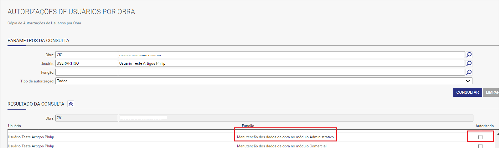 4 - Após à liberação da empresa, é preciso dar a liberação da obra ao usuário. Basta acessar Segurança/Autorizações/Usuários/Obras pesquisar pela obra que o colaborar está associado e pelo usuário que deseja o acesso, e marcar a flag "Manutenção dos dados da obra no módulo Administrativo" e salvar a alteração