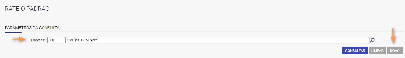 1. Para cadastrar um novo rateio padrão acesse: Financeiro / Contas a Pagar / Rateio Padrão, informe a empresa e clique em Novo.