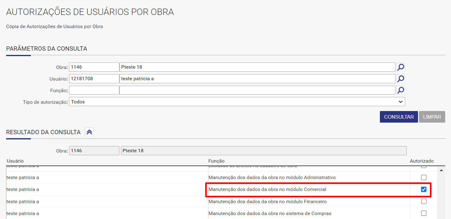 2.1) Consultar o usuário e a obra, editar e marcar a flag "Manutenção dos dados da obra no módulo Comercial"