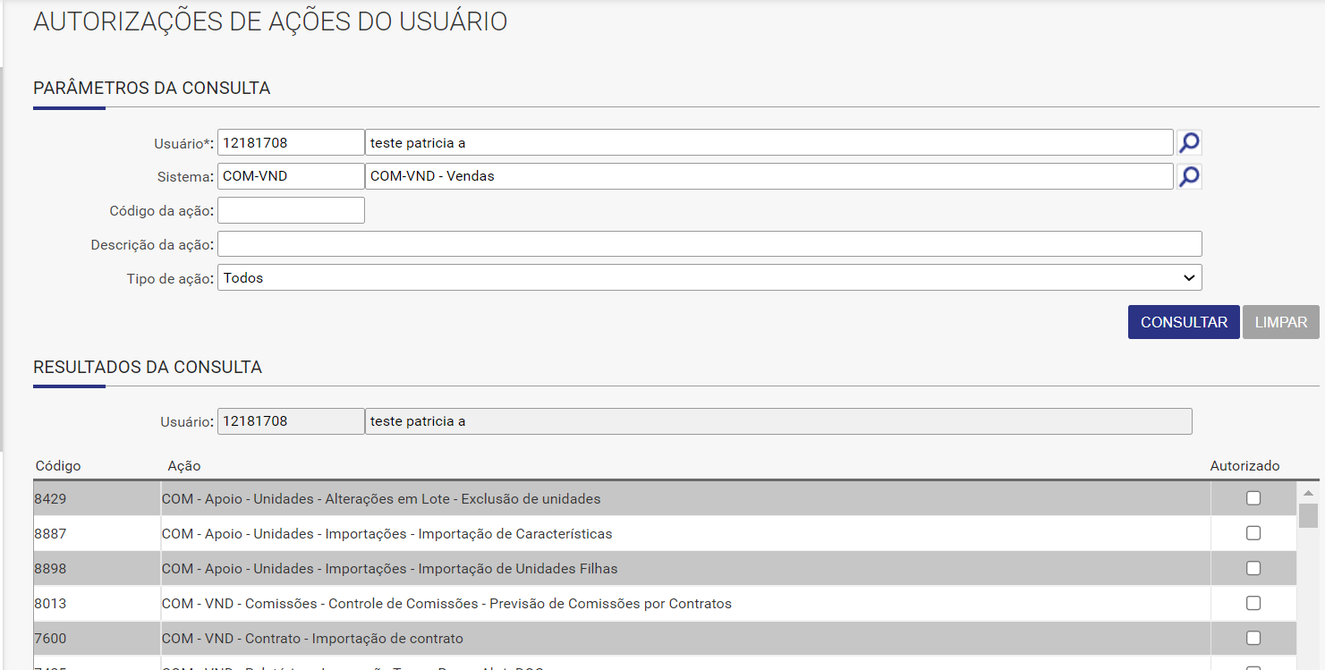 Acessar Segurança / Autorizações / Usuários ou Perfil / Ações do Usuário ou Ações do Perfil.