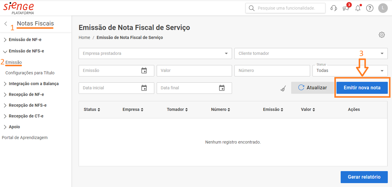 Iniciará com o lançamento da nota fiscal em Nota Fiscal > Emissão de NFS-e > Emissão > Emitir Nova Nota, conforme imagem abaixo: