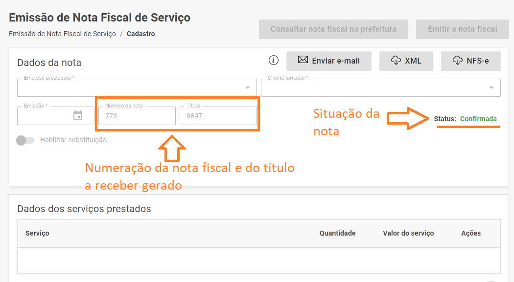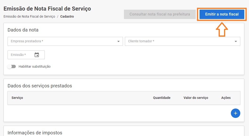 Em seguida realize seu preenchimento, informando o prestador, tomador, serviço, valor e tributação. Posteriormente, vá no botão "Emitir a Nota Fiscal" e aguardar seu processamento na prefeitura emitente.