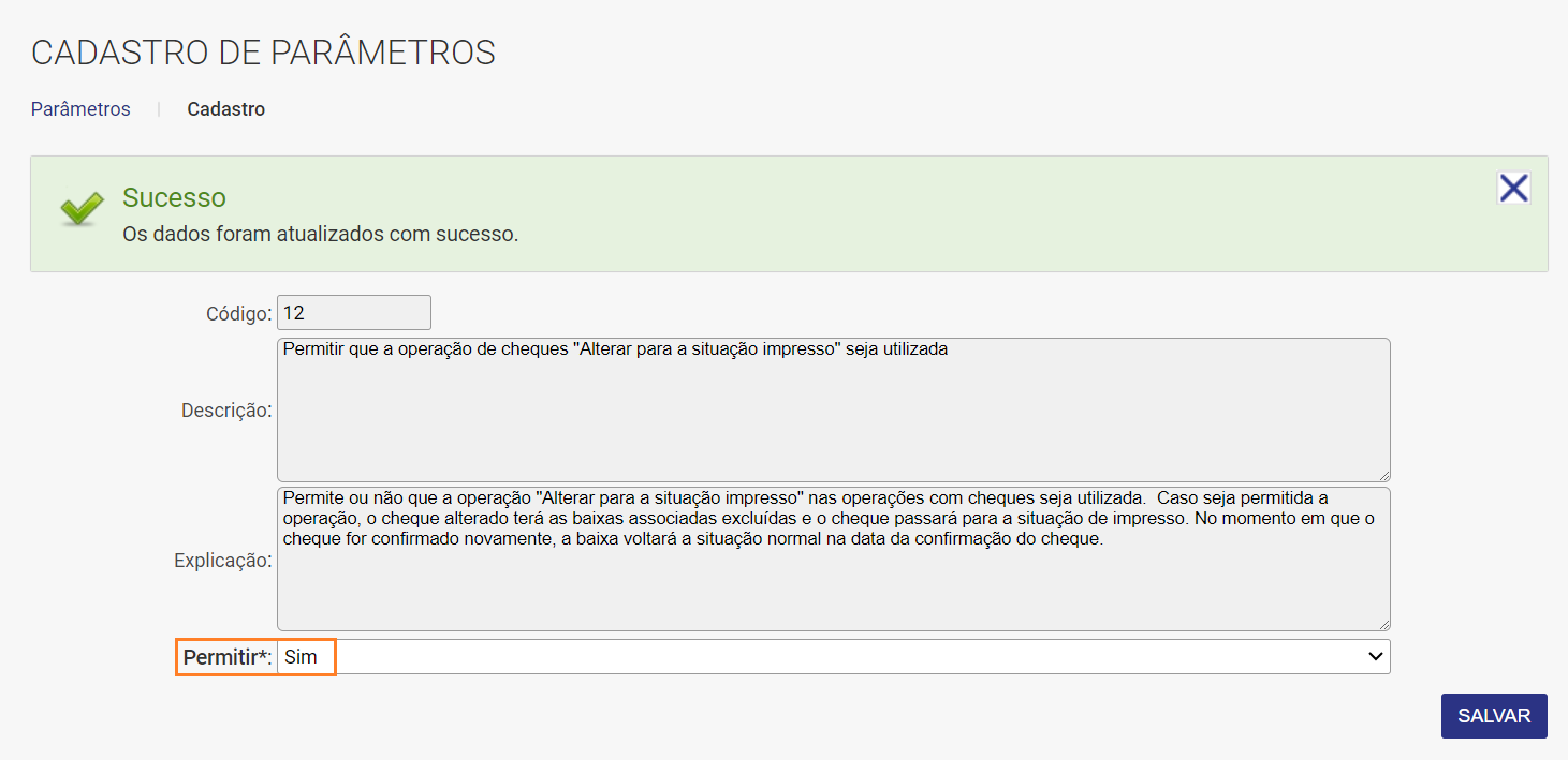 Possuir nas operações com cheque em: Segurança / Autorizações / Usuários / Financeiro e na tela de Parâmetros (Segurança / Administração / Parâmetros).