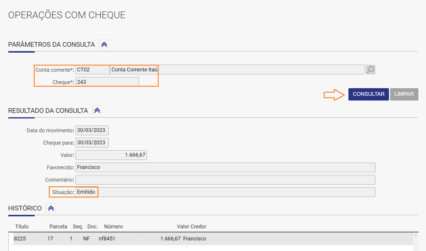 2. Após realizar a baixa do titulo e a emissão do cheque, acesse: Financeiro / Caixa e Bancos / Cheques / Operações com Cheques, informe conta e cheque e clique em Consultar, note que a situação estará como emitido: