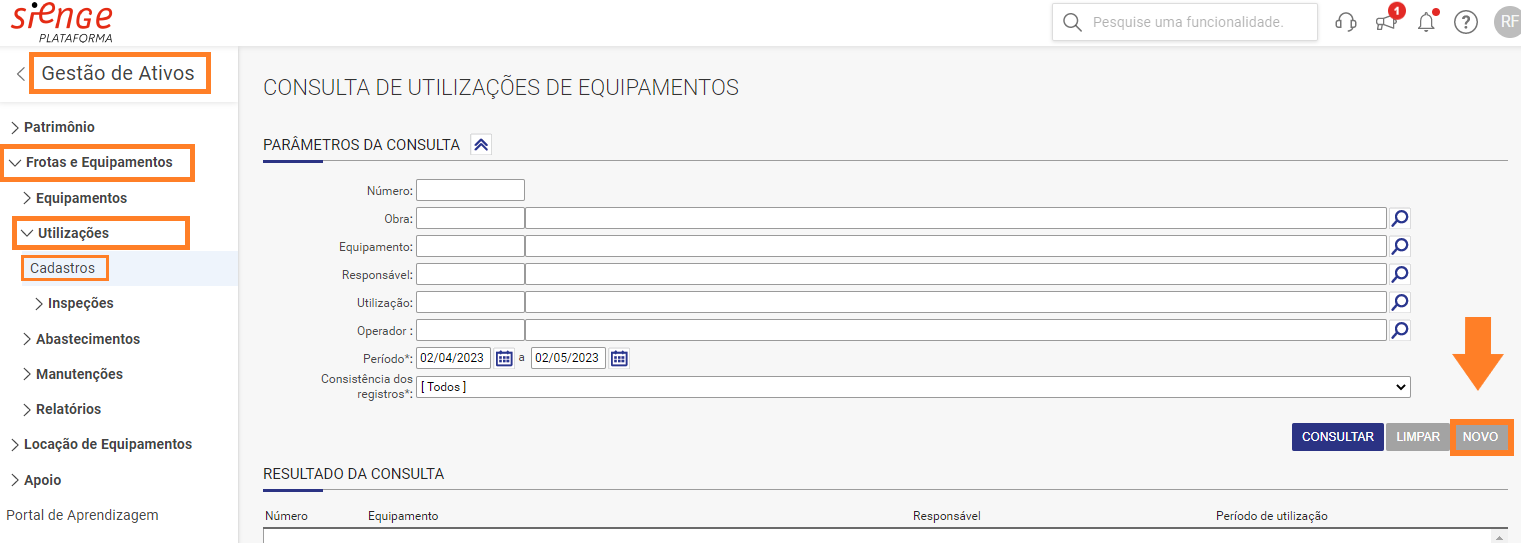 1. Acesse o menu Gestão de Ativos > Frotas e Equipamentos > Utilizações > Cadastros. Para registrar uma nova utilização, clicamos no botão NOVO.