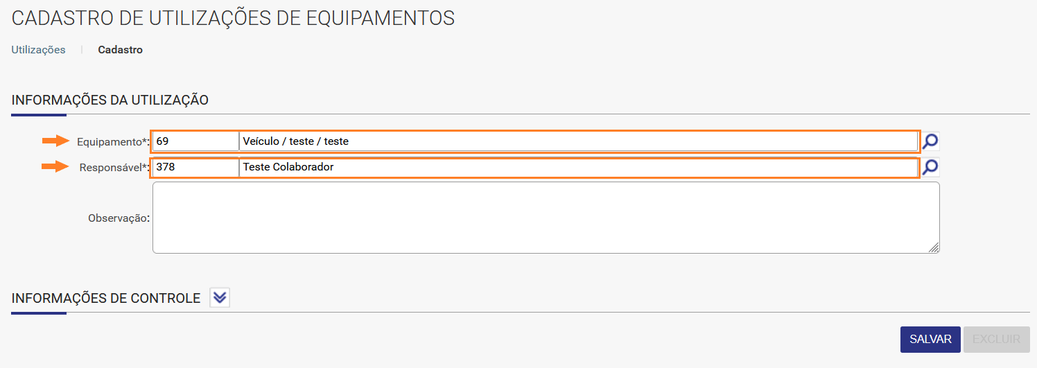 2. Informe o Equipamento e o Responsável pela utilização