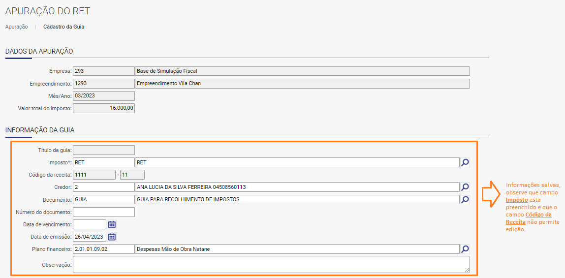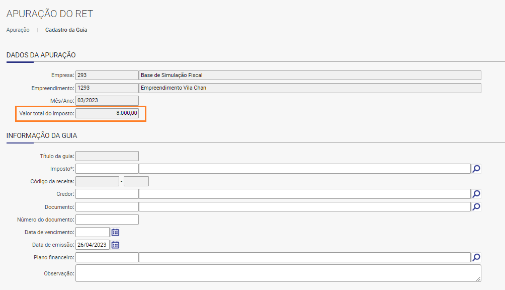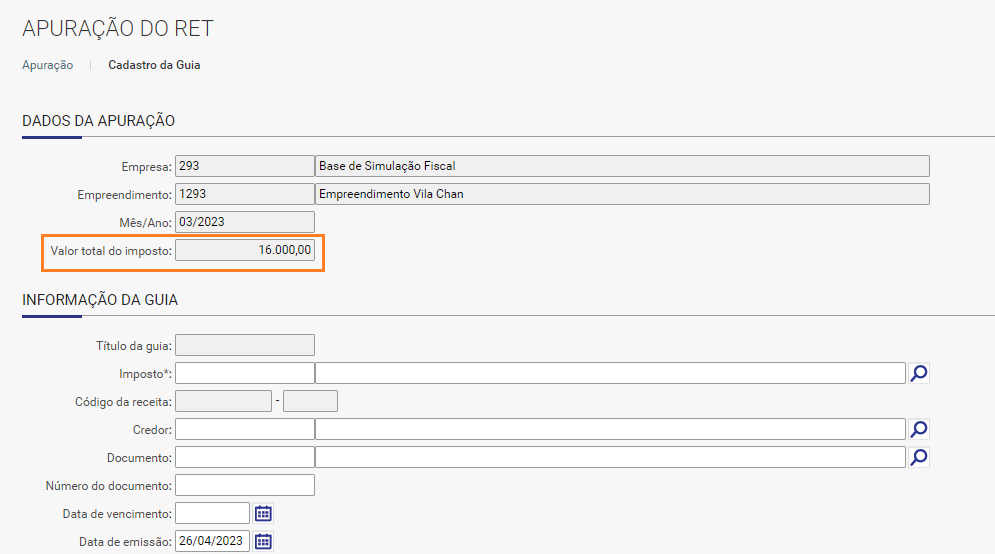 Por meio do botão “Gerar Guia de Imposto”, observe que persiste o valor que detalhei na 3º etapa.