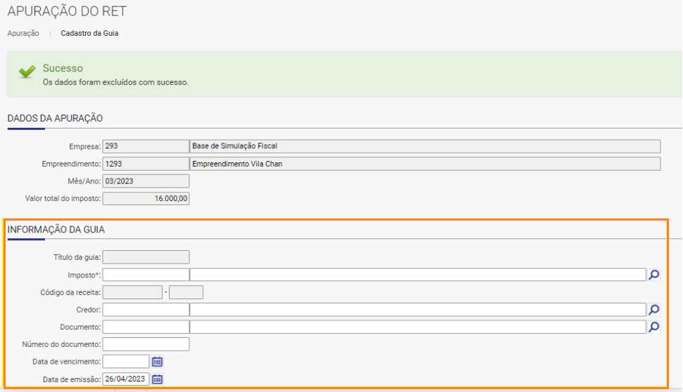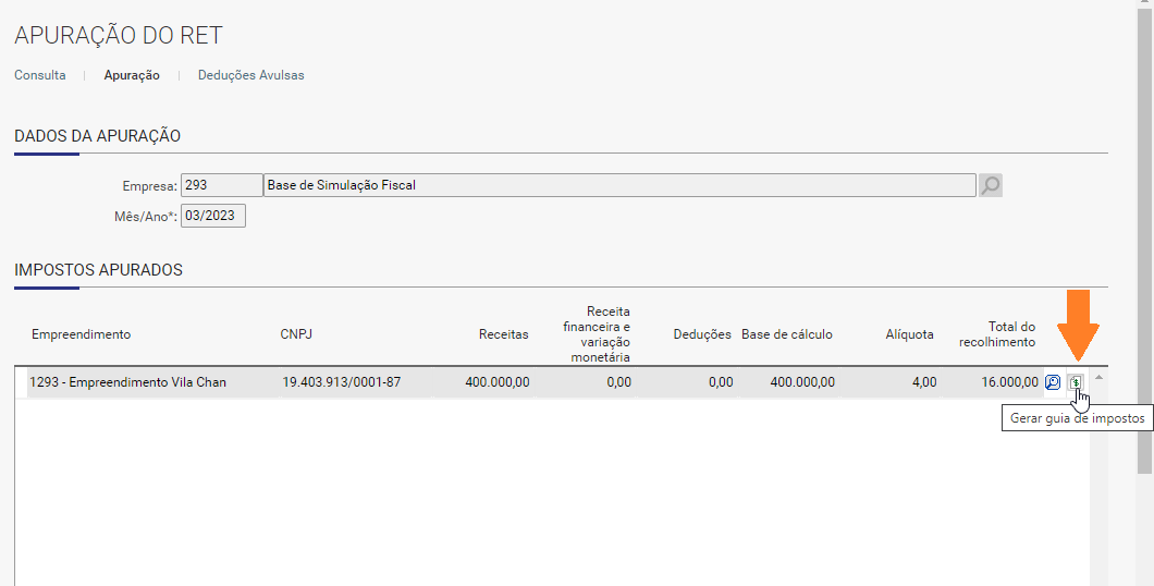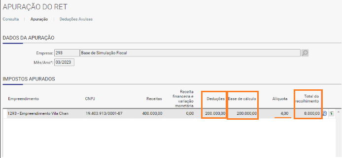Ao realizar a apuração do imposto RET, o valor da guia do imposto não considera a dedução avulsa incluída.