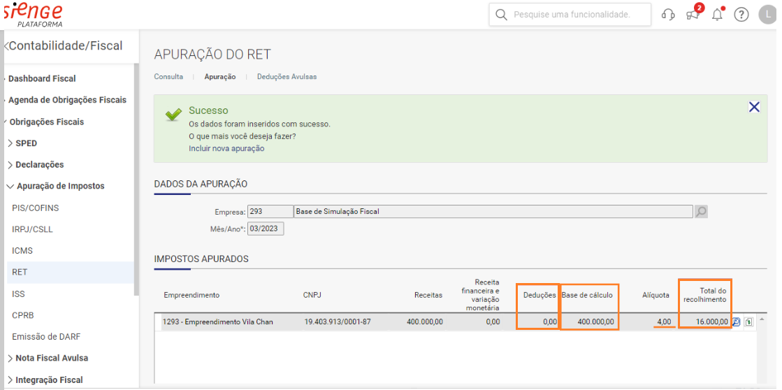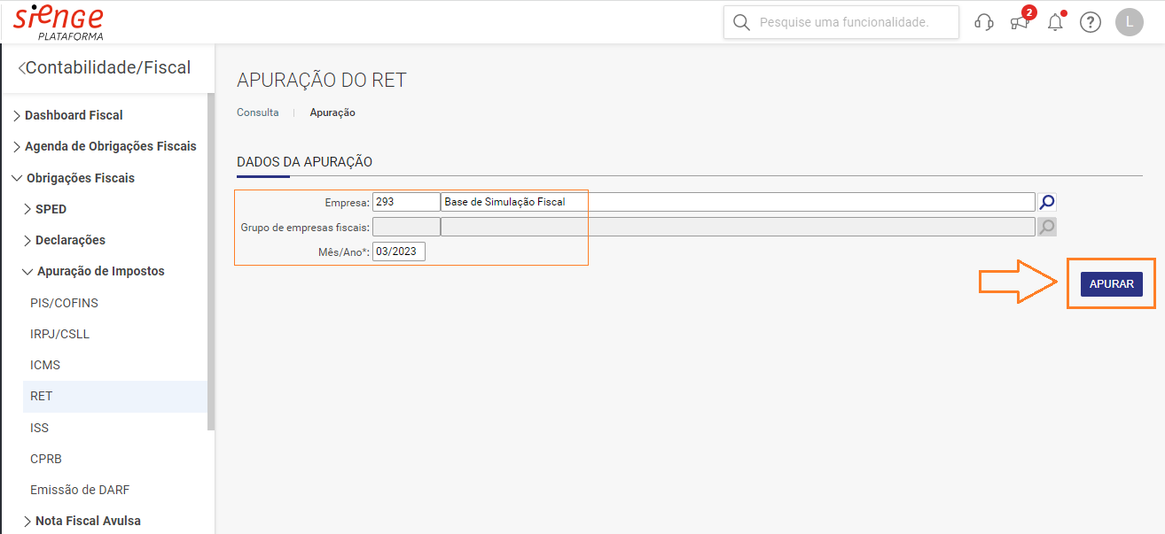 Em Contabilidade/Fiscal > Obrigações Fiscais > Apuração de Impostos > RET > Novo > Informar empresa e período > Apurar