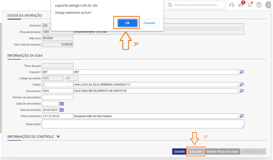 Para que seja atualizado o Valor Total do Imposto no cadastro da guia, é necessário que exclua as informações que salvou na 3º etapa. Para isso irei na opção Excluir no fim da página:
