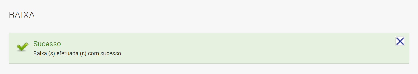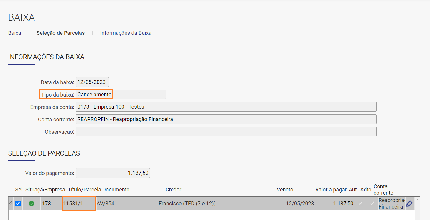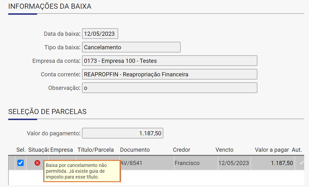 E ao acessar a tela de baixa, e realizar a tentativa de baixa de cancelamento, o sistema vai emitir essa mensagem! "Baixa por cancelamento não permitida. Já existe guia de imposto para esse título."