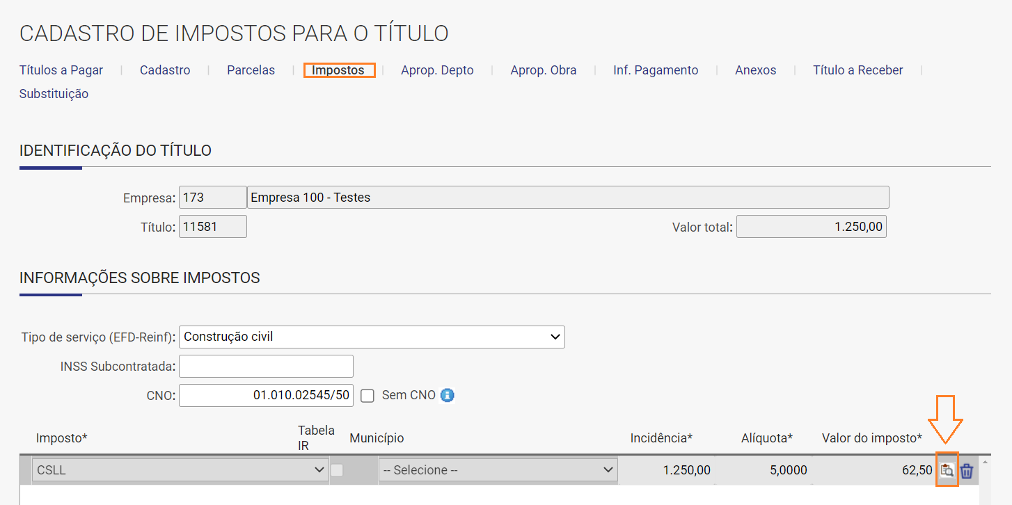 - Ao acessar o cadastro do título é possível ver que ele já possui a guia gerada, porém, é necessário baixar como cancelamento essa NF; (O ícone da prancheta e lupa, quando habilitado no cadastro do imposto, informa guia gerada)