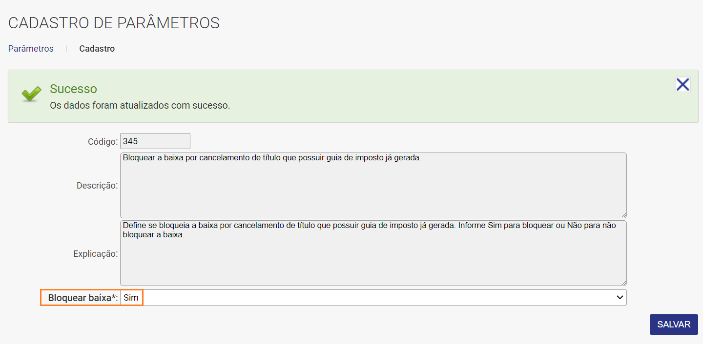Atenção! Caso deseje bloquear a baixa de cancelamento em NF com guia gerada, o parâmetro deve ser alterado para "SIM".