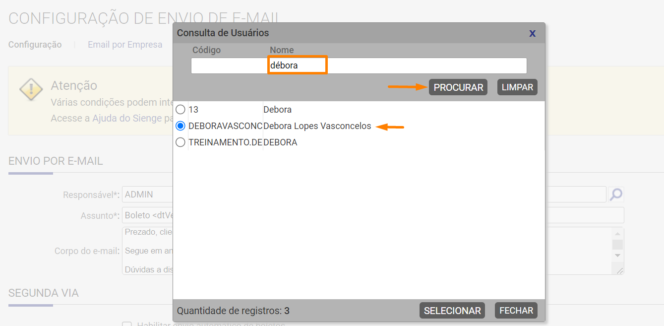 Nota! Essa opção não permite digitar o e-mail remetente, desta forma, precisará saber, qual o usuário do sistema está vinculado ao e-mail que deseja utilizar. Havendo dúvidas, poderá acessar Segurança / Usuário / Cadastros, digitar o e-mail e clicar em consultar.