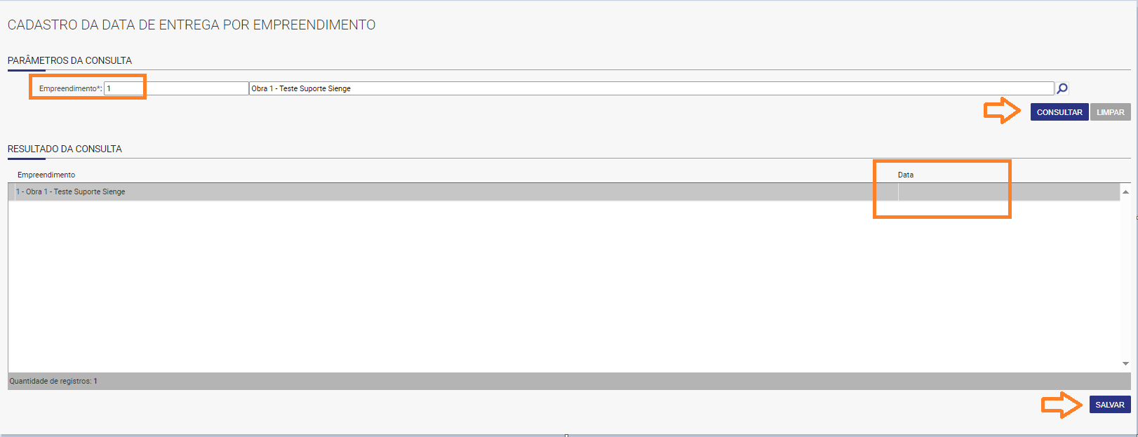 2. Consultar o empreendimento e fazer o preenchimento do campo da data e Salvar