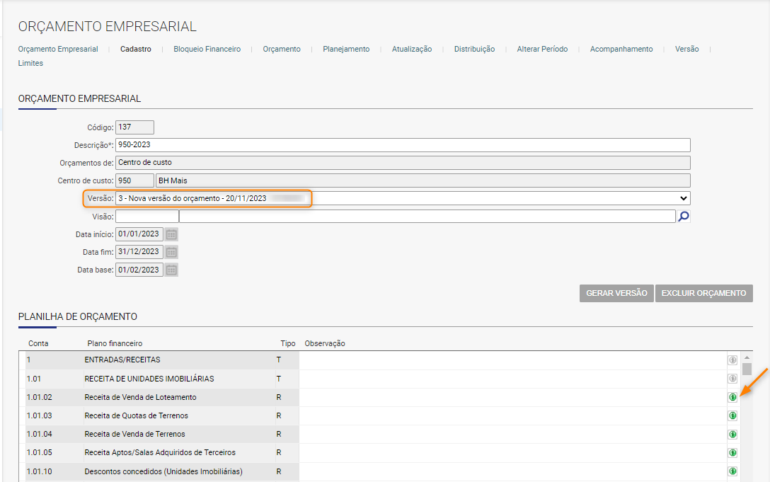 - Preencha o campo "descrição" e salve a versão, depois retorne para a aba Orçamento Empresarial;