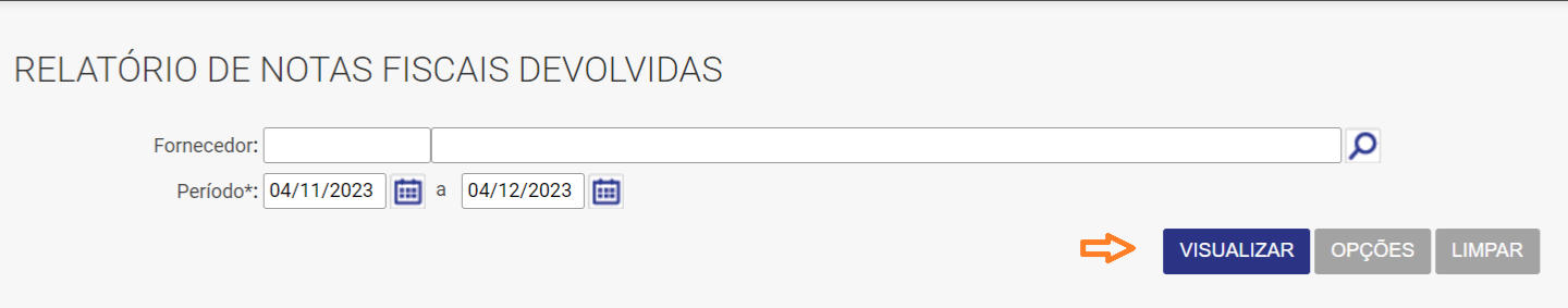 1. Acessar o menu Suprimentos > Compras > Relatórios > Notas Fiscais de Compra > Notas Fiscais Devolvidas. Para emitir o relatório basta clicar no botão VISUALIZAR.