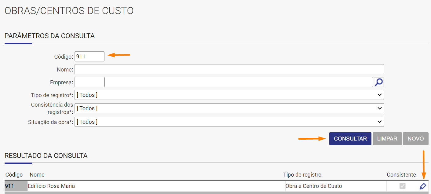 1- Acesse Apoio / Obras/Centros de Custo / Cadastros  e consulte o empreendimento que deseja configurar, após a consulta poderá clicar no lápis para edição;