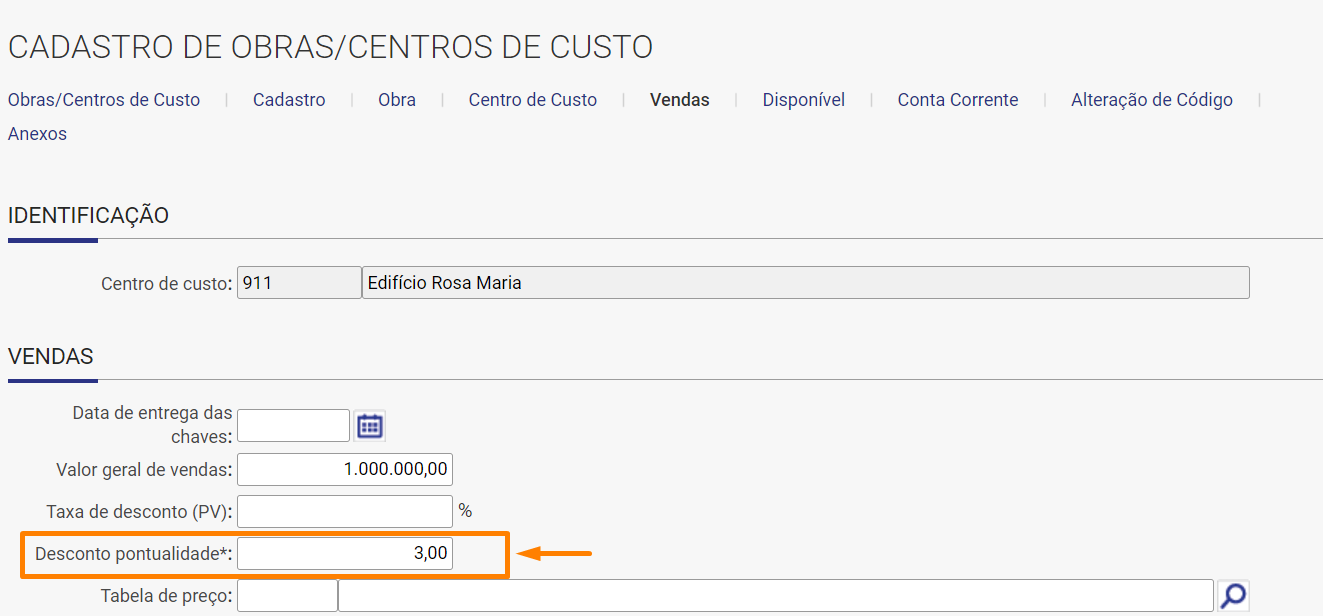 Atenção! Após essa configuração, os próximos contratos de vendas, cadastrados para o empreendimento, terão informação de desconto automaticamente preenchidas pelo sistema.