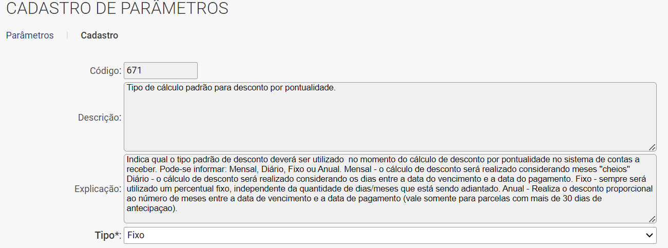 Nota! O parâmetro 671 (Segurança / Administração / Parâmetros) define qual o tipo de cálculo de desconto padrão, se Mensal, Diário, Fixo ou Anual, portanto, o tipo de desconto definido nesse parâmetro, que o sistema vai aplicar automaticamente nos contratos.