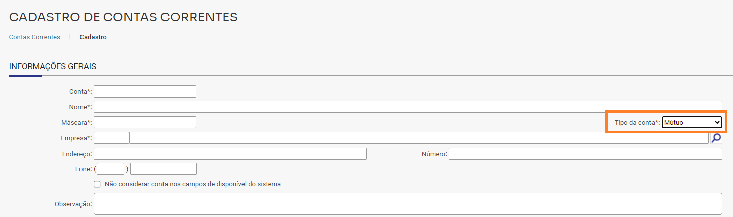 2. No campo Tipo da Conta, escolher a Opção Mútuo;